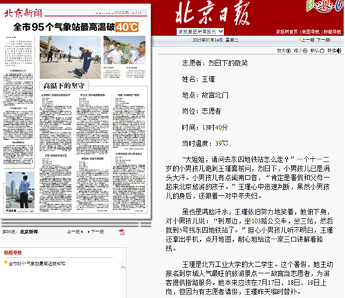 7月14日的《北京日报》第5版对伟德官网计算机学院、电子信息工程学院联合开展的故宫志愿服务活动进行了报道,文章对参与服务的志愿者进行了专题采访。