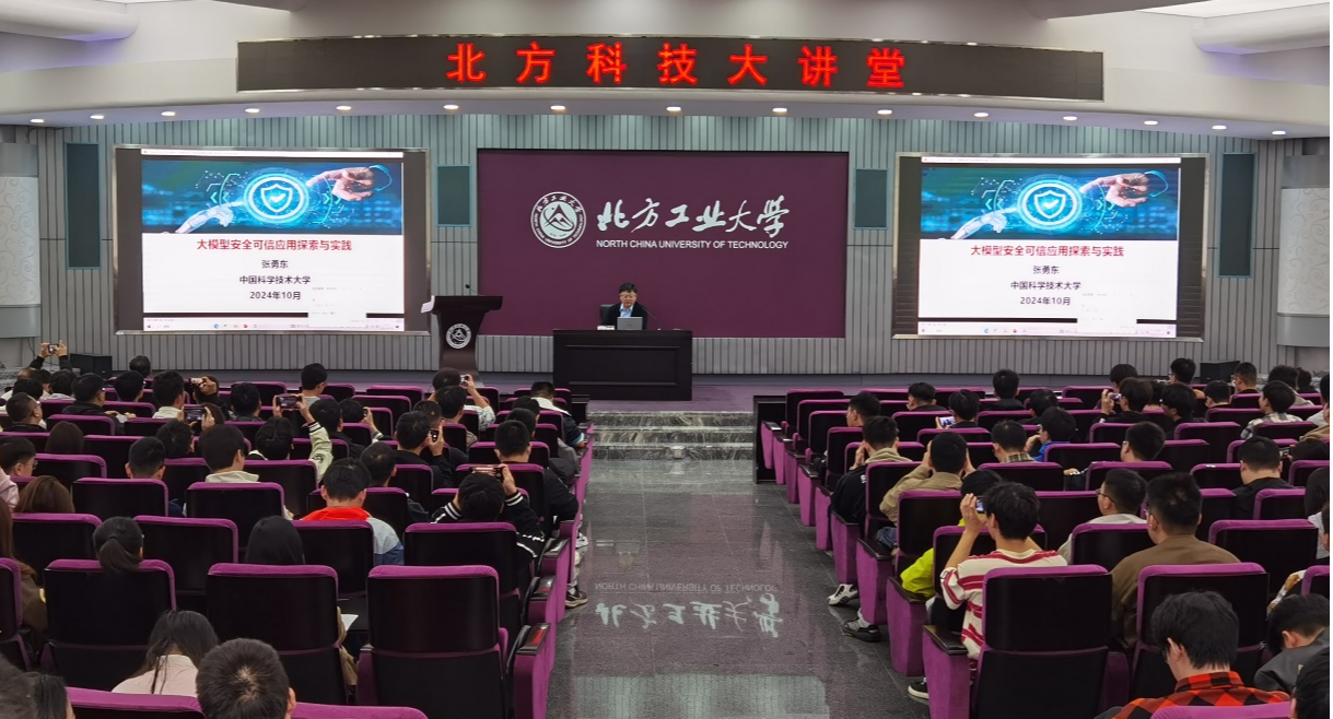 10月14日,中国科学技术大学教授、信息科学技术学院执行院长、国家杰出青年科学基金获得者、国家自然基金委创新研究群体项目负责人张勇东作为报告人,为伟德官网带来了题为“大模型安全可信应用探索与实践”的精彩报告。全校三百余名师生齐聚一堂,共同聆听这场学术大餐。报告会由信息学院院长马礼教授主持。会前,党委副书记、校长张立峰与张勇东教授进行了亲切交流,并为其颁发了北方科技大讲堂纪念铭牌。报告会上,张勇东教授从...