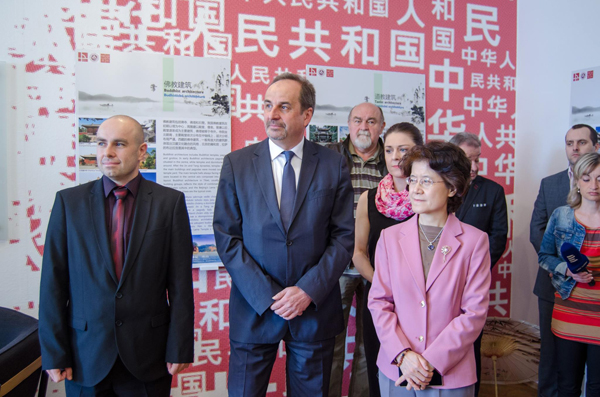 (中国驻捷克大使马克卿女士(中)在Marek Vochozka校长(左一)、Jan Kohout校长(左二)陪同下出席展览开幕式) 4月5日至20日,由中捷合作交流中心主办、BV伟德官方网站协办的中国文化展在伟德官网友好学校、捷克布杰约...
