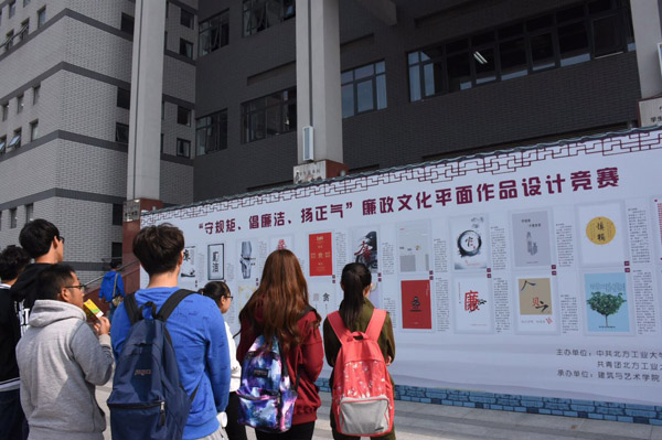 9月29日,由中共BV伟德官方网站纪律检查委员会、共青团BV伟德官方网站委员会主办,建筑与艺术学院承办的“守规矩、倡廉洁、扬正气”——廉政文化平面作品设计竞赛展在毓秀广场举行。