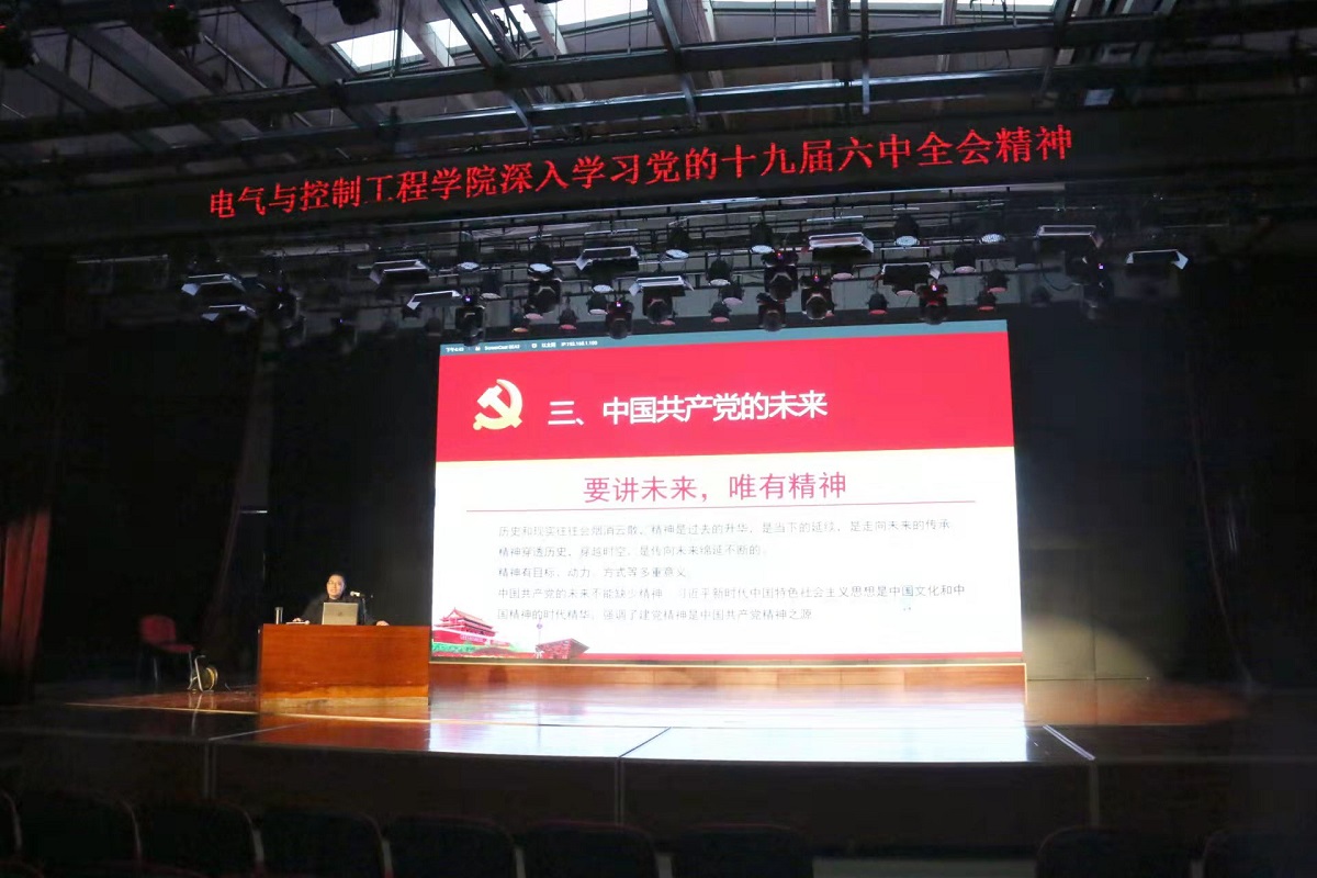11月25日下午,电气与控制工程学院党委在学生综合服务楼多功能厅召开了学院党员大会,专题学习党的十九届六中全会精神。大会特邀伟德官网党的十九届六中全会精神师生宣讲团成员、马克思主义学院周守高老师作宣讲报告,学院党委委员、全体师生党员共计300余人参加了大会,学院党委书记李颖宏主持报告会。周守高老师从时空两个维度、四个方面结合中国共产党党史深入解读了党的十九届六中全会做出的大会决议报告。首先以“三个历史决议”为引,...