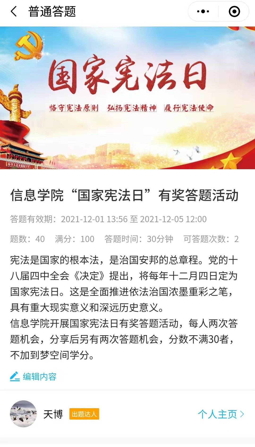 为深入学习贯彻习近平总书记宪法重要论述精神,全面加强宪法实施和监督,普及宪法知识,弘扬宪法精神,增强法治意识,提高学生法律素养,营造校园法治文化氛围,强化学生自我保护意识,培养学生养成学法、懂法、守法、用法的好习惯,有效地树立和维护学校良好的学风校风。信息学院于11月29日至12月16日开展“弘扬宪法精神,构建和谐校园”宪法知识竞赛。为严格落实疫情防控要求,本次宪法知识竞赛采用线上云竞答的方式进行,120...