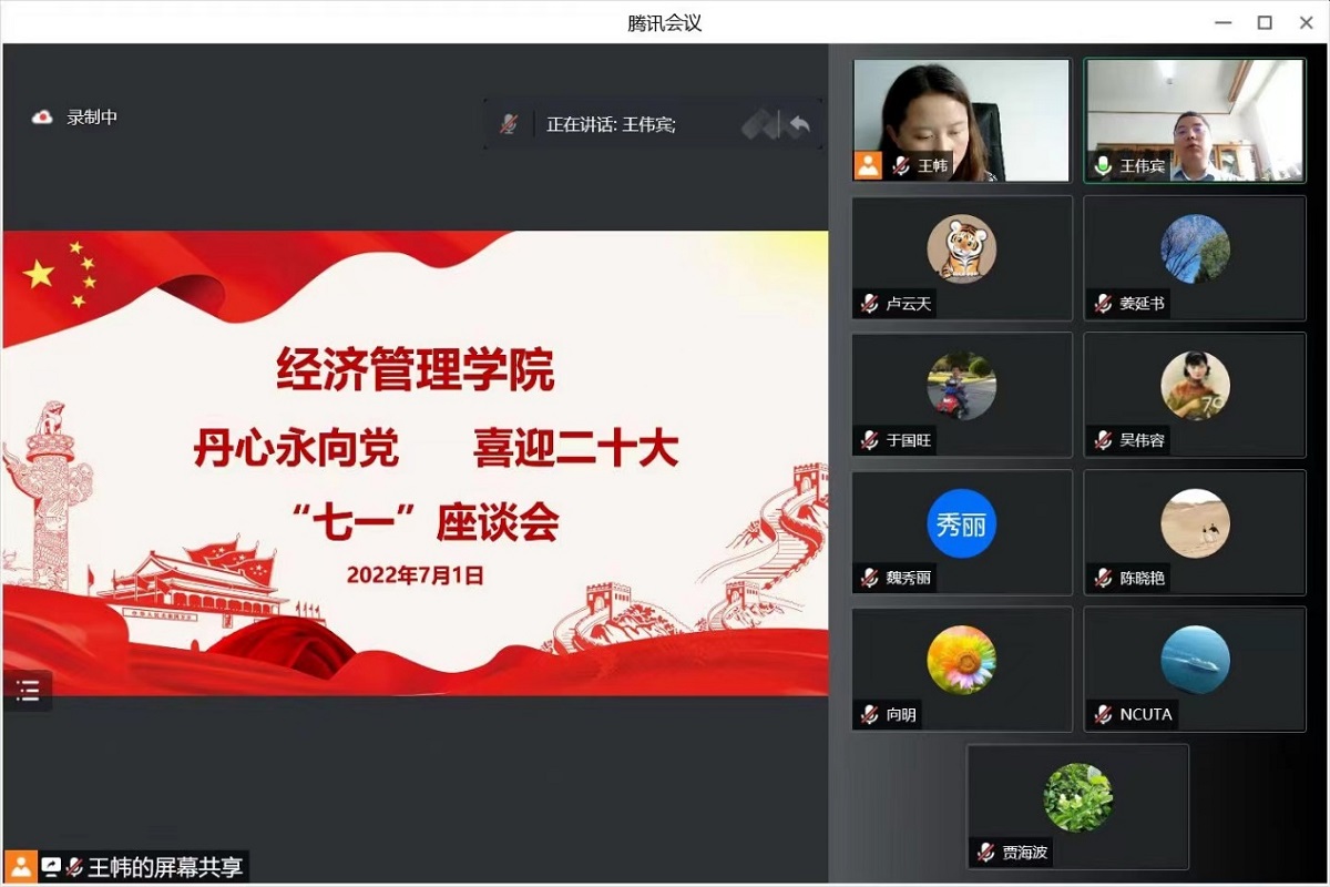 在中国共产党成立101周年之际,为激励学院广大教师党员进一步发挥战斗堡垒作用和先锋模范作用,经济管理学院党委组织召开党员“七一”座谈会。学院党员教师代表参加会议,会议由学院党委副书记王帏主持。各位老师从国家、学校、学院、个人四方面进行发言,为党领导全国人民在中国特色社会主义建设事业上取得的巨大成就感到自豪,也为学校的飞速发展感到欣慰。他们表示:在两个百年交汇的历史时刻,一定铭记党的奋斗历程,不忘初...