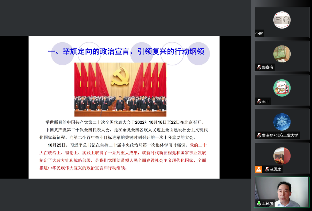 11月18日下午,离退休党委理论学习中心组召开线上学习会,专题学习党的二十大精神。离退休党委委员王包泉作专题宣讲,党委委员、党支部书记、副书记、支部委员、全体工作人员等近30人参加了学习,学习会由离退休党委书记赵永兵主持。王包泉以“认真学习党的二十大精神,以中国式现代化全面推进中华民族伟大复兴”为主题,从“举旗定向的政治宣言、引领复兴的行动纲领,领航新时代新征程的坚强领导集体,以中国式现代化全面推进...