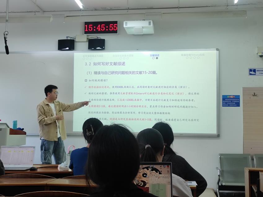 5月8日下午,经济管理学院励学论坛第七期在励学楼310教室举行,BV伟德官方网站经济管理学院经济研22级在读优秀研究生赖凯丰进行了主题为“研究生论文写作分享”的讲座。本次讲座赖凯丰同学结合自身在学术道路上摸索的经验对研究生论文写作的思路和方法作了详尽的介绍。首先他点出论文初学者的难点和误区,主要是缺乏理论认识和知识创新理解导致内容逻辑不足。其次,讲解了实证论文的基本逻辑。然后着重讲解了论文中的文献综述部分...