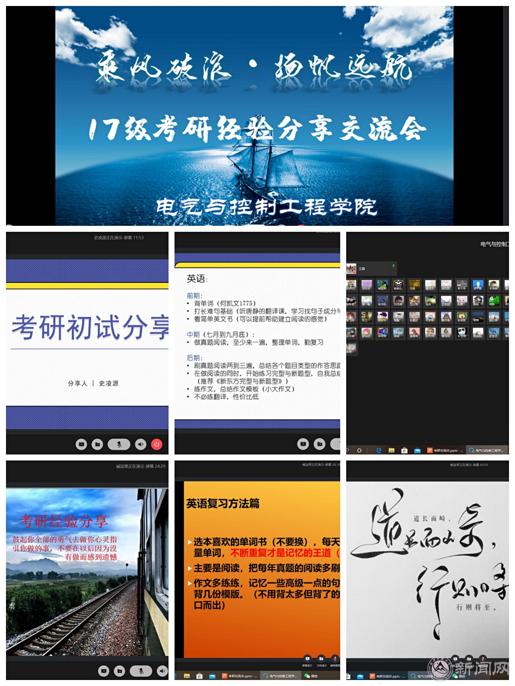 3月21日下午,电控学院通过企业微信举办了2017级线上考研动员暨经验交流会。16级各专业今年考研成绩突出的史凌源、臧益果、黄一俊、吴天宇以及成功保研的孙炳利等同学主讲。五位同学根据自身的经验,分别向17级的各位同学介绍了如何系统地进行考研备战,为大家“传经送宝”。会议由辅导员王磊老师主持。交通16-2班史凌源从“如何选择学校和专业”、“考研前期如何准备”、“复习时的总节奏”和“考研过程中适用的方法”四个方...