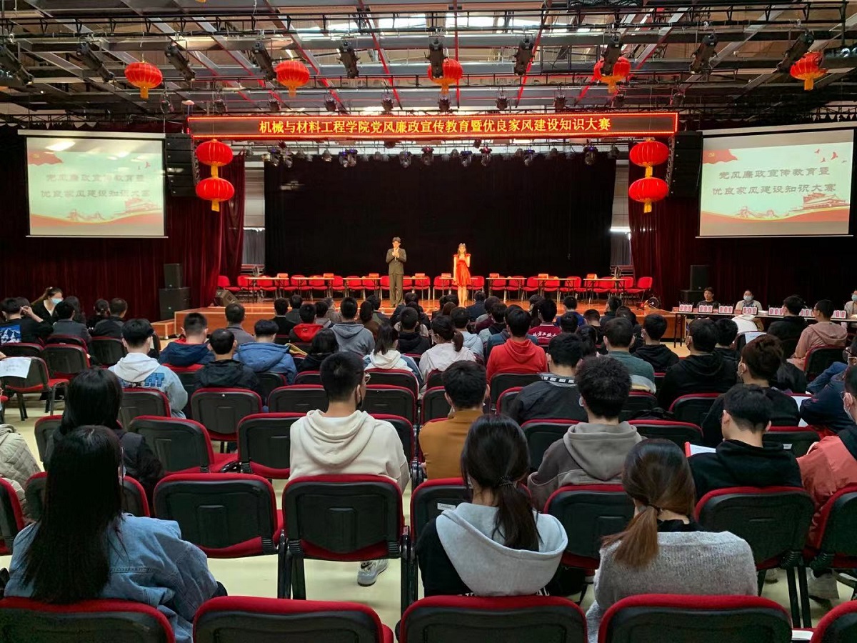 11月12日下午,机械与材料工程学院党风廉政宣传教育暨优良家风建设知识大赛在学生多功能厅举办。全院师生党员、入党积极分子、学生代表近400人一同观看了知识大赛。 伴随着诗朗诵《英雄》,本次知识竞赛正式拉开帷幕。参加本次知识竞赛的团队由8支学生党支部党员代表队组成,分为必答题、抢答题和选答题三轮环节。最终,工设本科学生党支部代表队以明显优势获得了比赛冠军。本次活动形式多样、内容新颖,观众互动环节气...