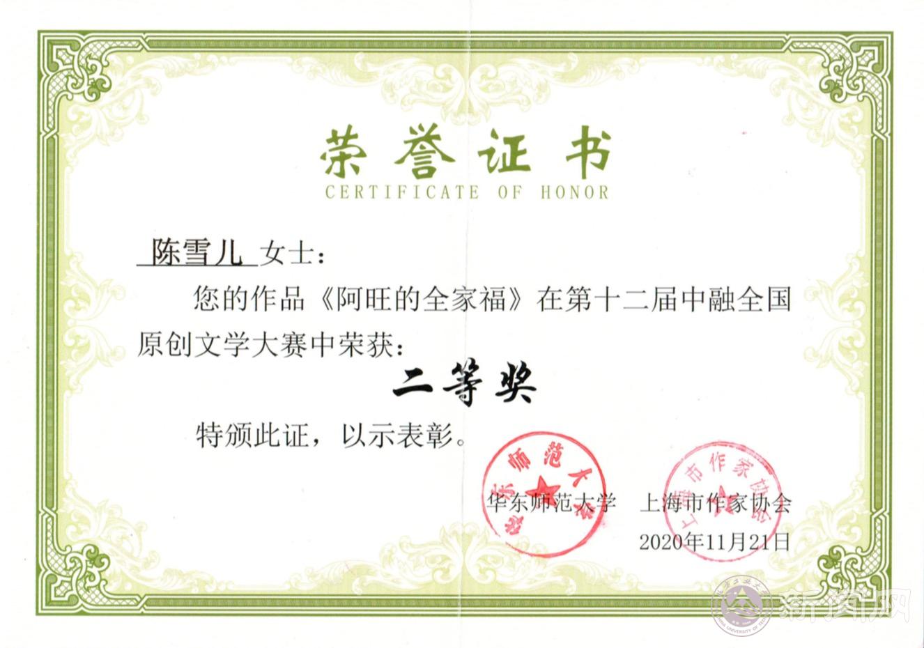 日前,第十二届中融全国原创文学大赛暨第四届上海市大学生原创文学大赛获奖结果在上海揭晓,伟德官网文法学院中文17-3班学生陈雪儿的原创作品《阿旺的全家福》获得二等奖的好成绩。
