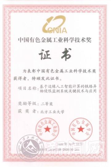 近日,中国有色金属工业协会、中国有色金属学会公布了2020年度中国有色金属工业科学技术奖授奖项目,伟德官网作为第一完成单位申报的“基于边缘人工智能计算的铁路异物侵限监测系统关键技术与应用”项目获得二等奖。