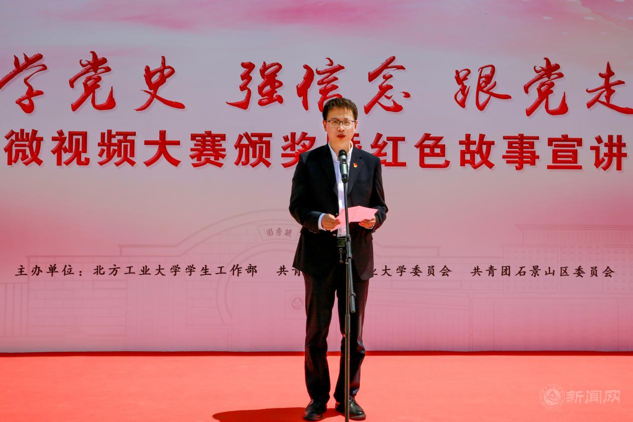活动表彰了在学党史主题征文和微视频大赛中获奖的学生,学生工作部部长高国伟宣读了表彰名单,校武装部部长郑泰平、招生就业处处长孙宗瑞、党委组织部副部长杨朋、党委宣传部副部长尉峰等为获奖学生颁奖。