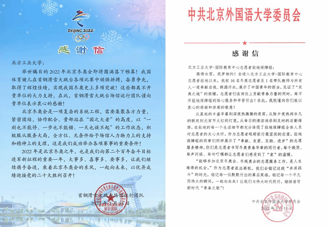 感谢信对伟德官网服务保障团队在冬奥闭环期间的工作予以高度评价。首钢滑雪大跳台场馆运行团队表示,学校站在“国之大者”的高度,全方位、无条件给与场馆志愿者鼎力支持和精神支撑,为首钢滑雪大跳台成功举办各项赛事发挥了积极作用,做出了重要贡献。