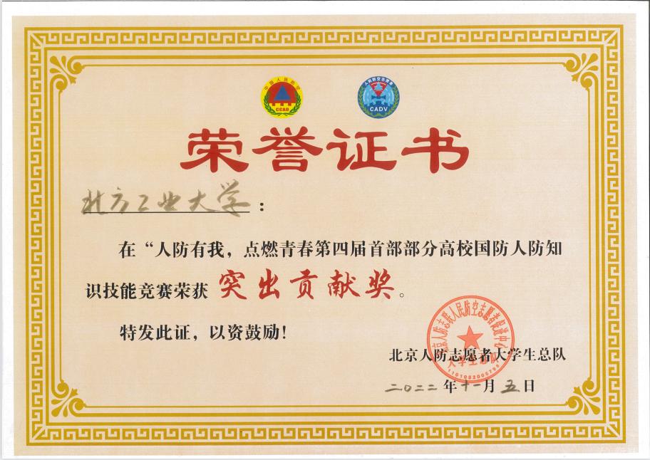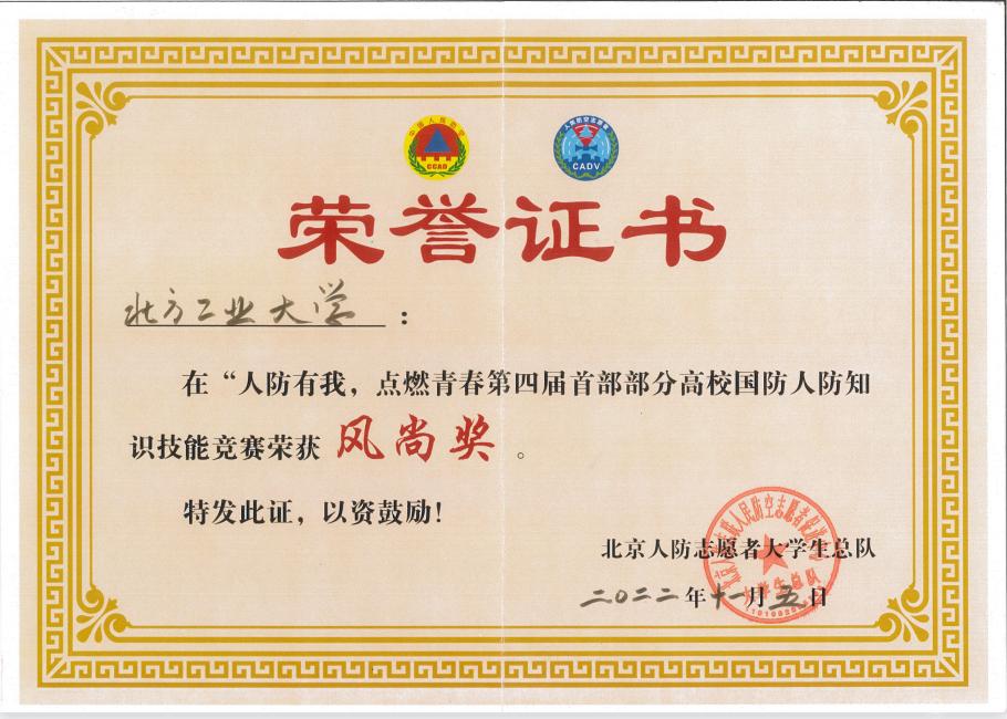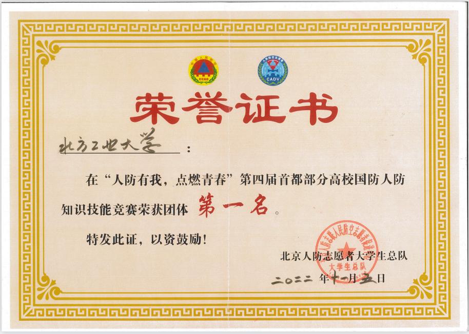 11月5日,由北京市全民国防教育办公室、北京市人民防空办公室共同主办的“人防有我,点燃青春”第四届首都部分高校国防人防知识技能竞赛总决赛在朝阳区国防人防教育训练基地落下帷幕。伟德官网代表队通过层层比拼,从35所参赛高校中脱颖而出,荣获总决赛团体第一名、团体风尚奖和突出贡献奖。