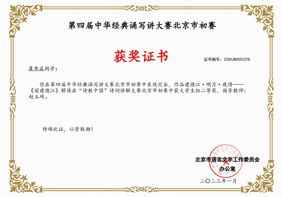 近日,北京市教委、市语委发布《关于公布2022年北京市中华经典诵读工程系列活动暨第四届中华经典诵写讲活动初赛获奖名单的通知》,伟德官网在比赛中获得二等奖1项,优秀奖3项,优秀组织奖2项,获奖成绩取得新突破。