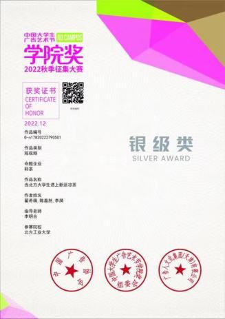 广告20级张语嫣、王文爽、袁梦凝同学的短视频作品《安德普泰小剧场:战“痘”》荣获金奖,广告20级翟希萌、陈嘉然、李漪同学的短视频作品《当北方大学生遇上新派凉茶》荣获银奖。此外,来自广告学系2020级、2021级的同学们还荣获优秀奖9个、入围奖10个。