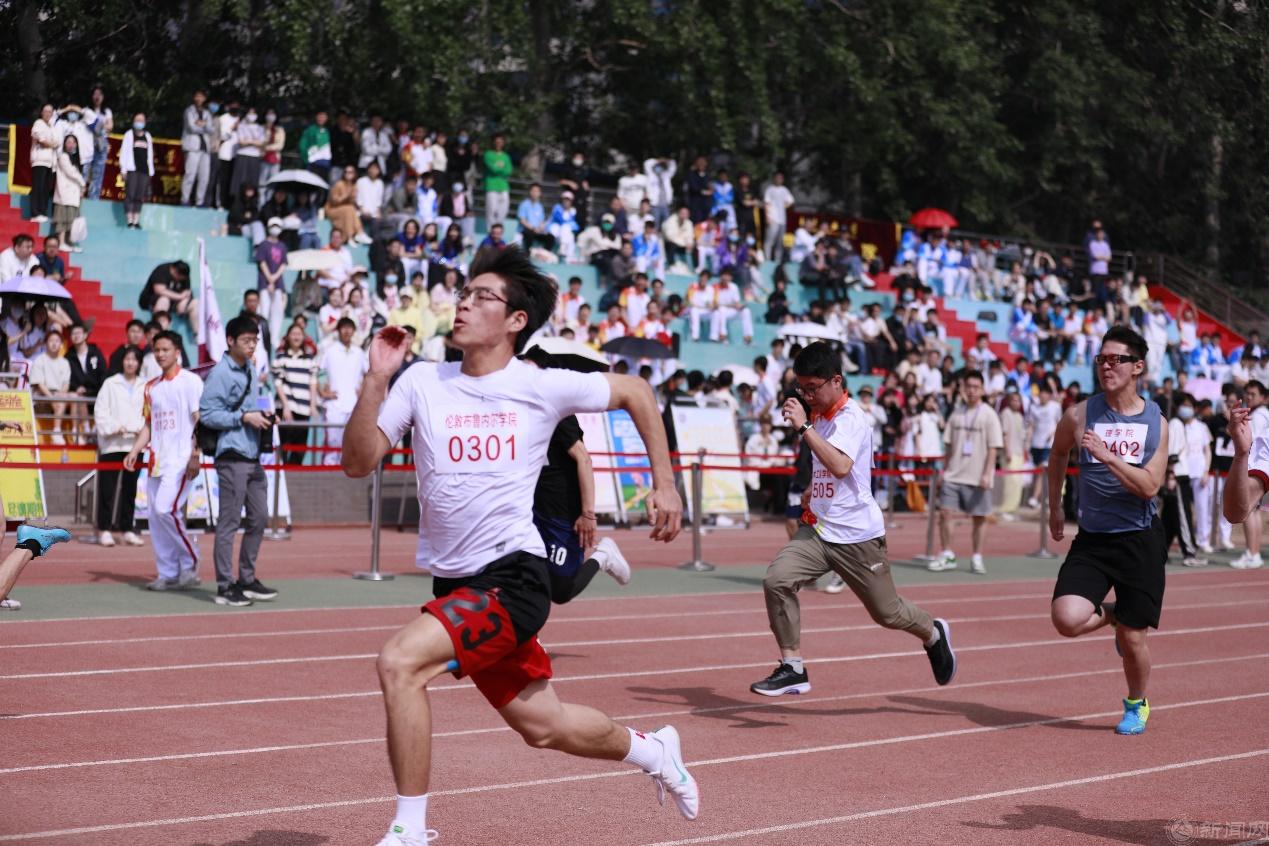 观众看台上五彩斑斓,各学院院旗随风舞动,鼓声、口号声、呐喊声此起彼伏,运动场上洋溢着激情、文明、和谐的氛围。