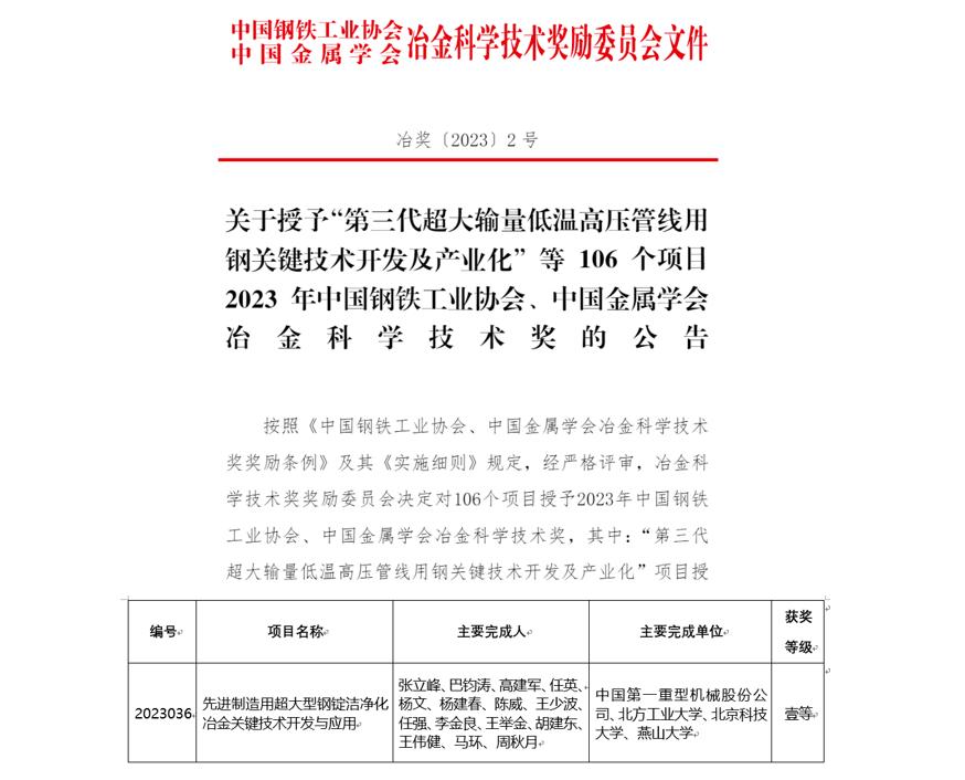 2023年9月15日,冶金科学技术奖奖励委员会决定对106个项目授予“2023年中国钢铁工业协会、中国金属学会冶金科学技术奖”,以张立峰校长为第一完成人,伟德官网为第二完成单位的“先进制造用超大型钢锭洁净化冶金关键技术开发与应用”项目喜获一等奖。
