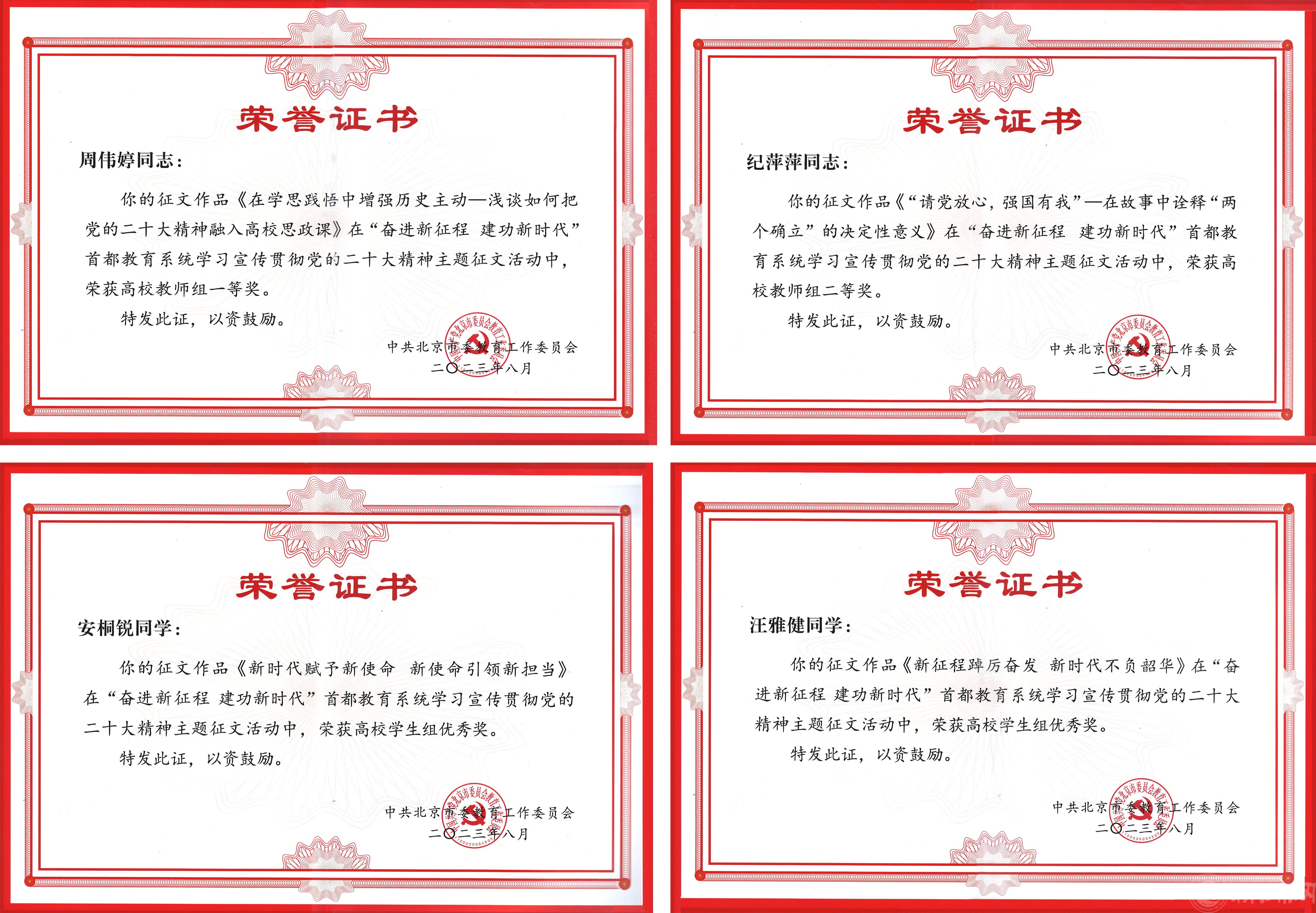 近日,由北京市委教育工委、北京市教育委员组织开展的“奋进新征程 建功新时代”主题征文活动获奖名单公布。伟德官网马克思主义周伟婷、纪萍萍分获高校教师组一、二等奖,文法学院安桐锐、伦敦布鲁内尔学院汪雅健获高校学生组优秀奖。