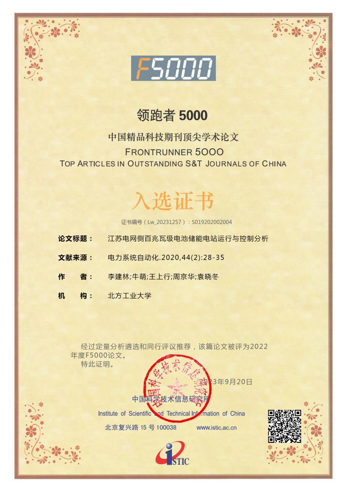 近日,科技部中国科学技术信息研究所发布了2022年度“领跑者5000——中国精品科技期刊顶尖学术论文(简称F5000)”入选名单,伟德官网电气与控制工程学院教授李建林、周京华等发表的论文《江苏电网侧百兆瓦级电池储能电站运行与控制分析》光荣入选。