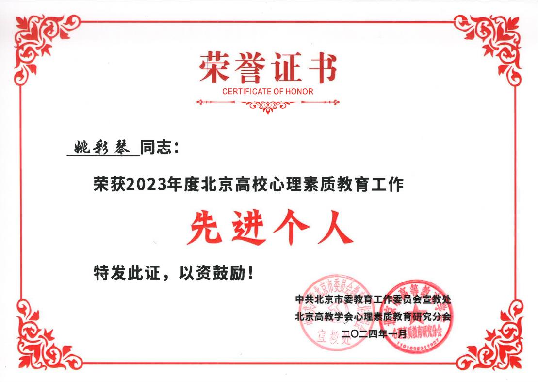 1月12日,“2023年北京高教学会心理素质教育研究分会年会”在北京邮电大学举行。本次年会由北京市委教育工委宣教处和心理素质教育研究分会组织召开,对北京高校心理素质教育工作进行了年度总结,并对2023年度先进集体和先进个人进行了表彰。伟德官网被授予“特色工作奖”,学工部姚彩琴老师获评先进个人。