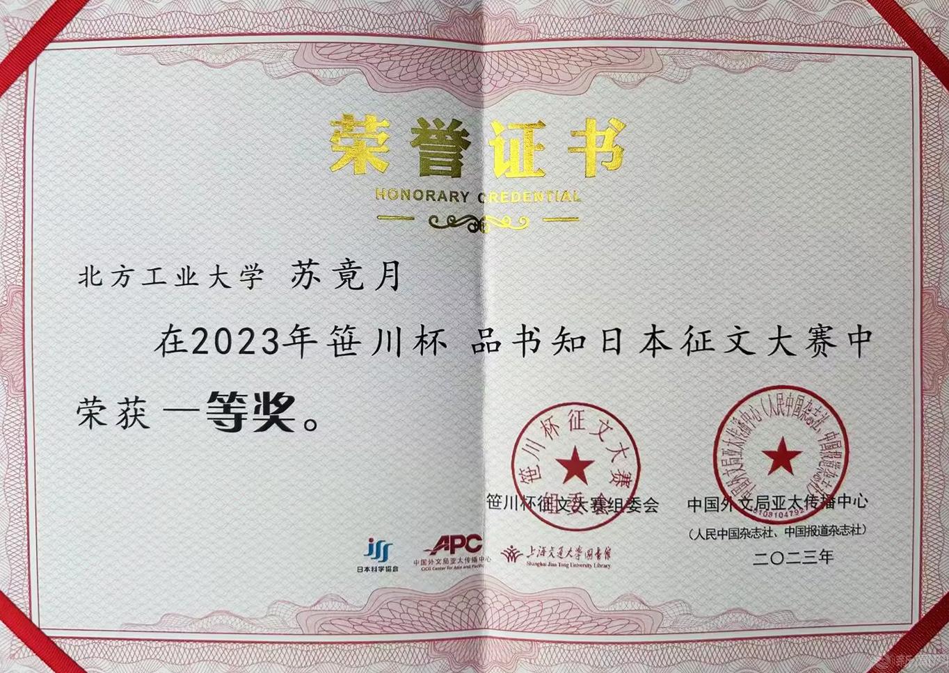 本次大赛共收到来自全国各地的参赛作品1900余篇,最终评选出一等奖4名,二等奖8名、三等奖30名、优秀奖40名、优秀指导教师奖35名。苏竟月同学是伟德官网日语系2023届本科毕业生,并于同年9月考入伟德官网外国语言文学硕士点日语语言文学专业,此次获奖体现了日语系及外国语言文学学科注重培养学生创意和写作能力、跨文化交际能力的实践教学成果。