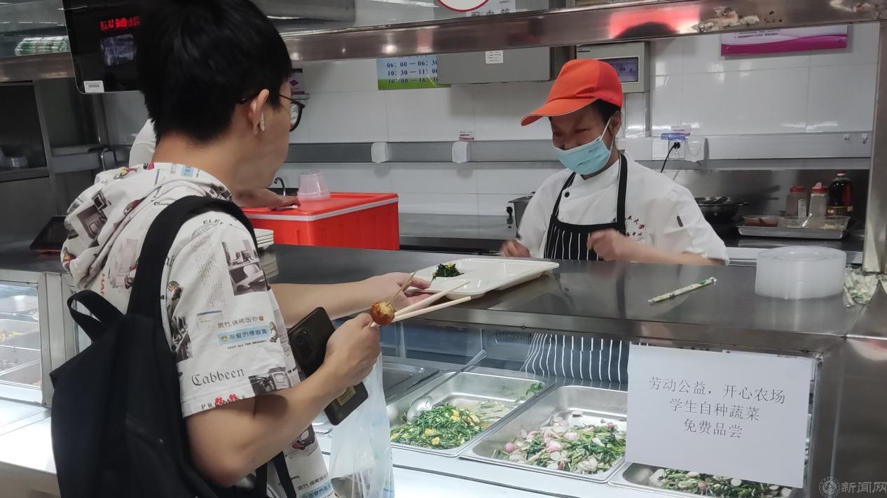 “开心农场”的农作物全部采用生物防治的方式培育,属于无公害蔬菜。采摘完成后,大家洗净一部分蔬菜现场品尝,其余部分统一送到食堂。食堂师傅们利用这些纯天然的食材,精心烹饪出多道美味佳肴,供学生免费品尝。