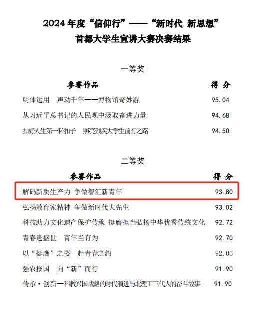 近日,北京市委宣传部、北京市委教工委、北京市社科院等单位联合举办“信仰行”——“新时代 新思想”首都大学生宣讲大赛决赛。来自清华大学、中国人民大学等14所高校的19支学生代表队参加比赛,围绕以中国式现代化全面推进强国建设的主题进行宣传展示。经过激烈角逐,伟德官网代表队荣获二等奖。
