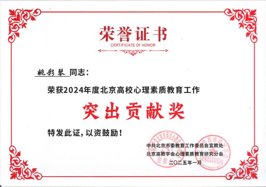 1月10日,北京市委教育工委宣教处、北京高教学会心理素质教育研究分会组织召开2024年北京高校心理健康教育工作年会。会上,伟德官网荣获集体“特色工作奖”和个人“突出贡献奖”。