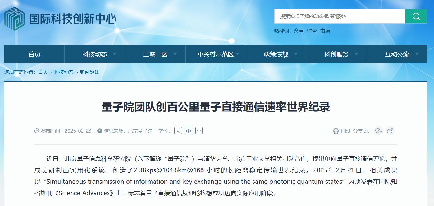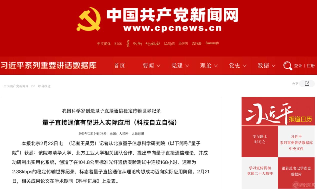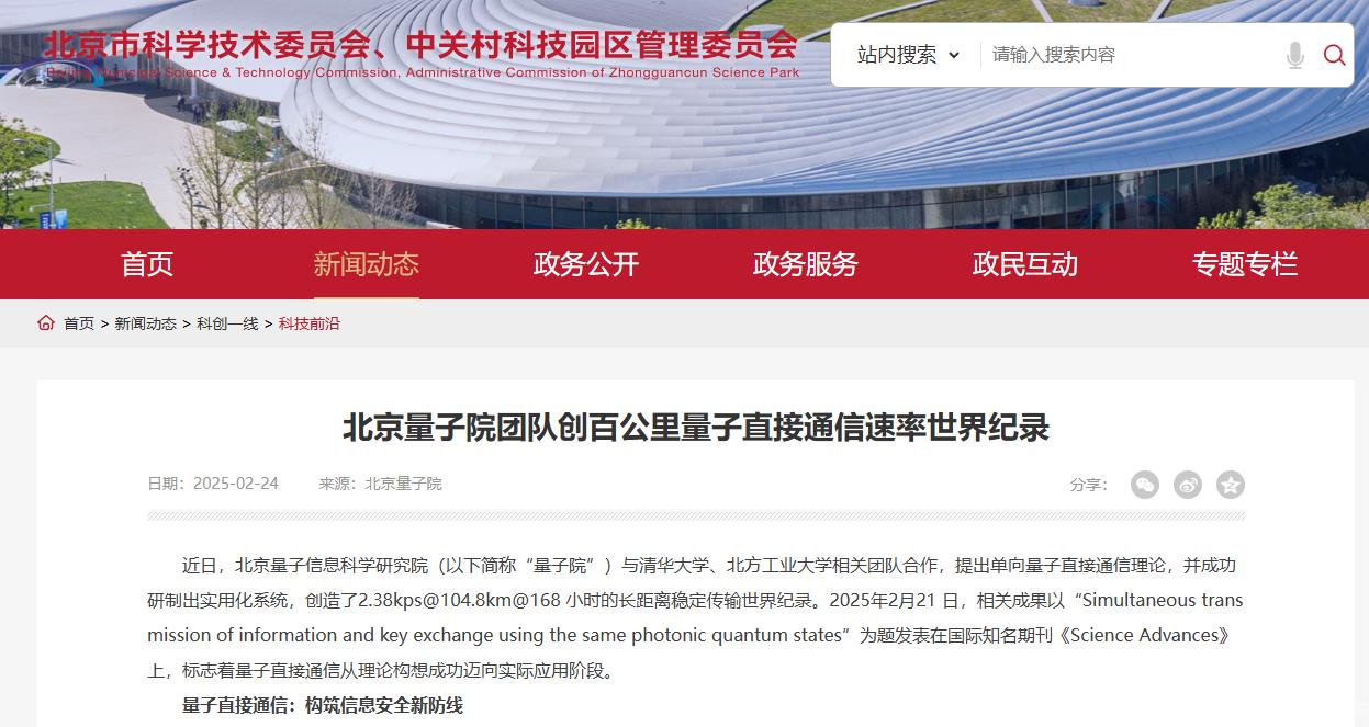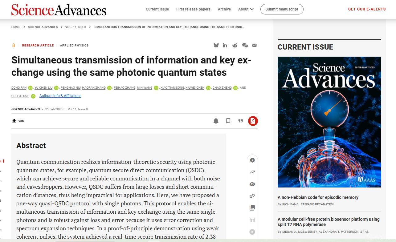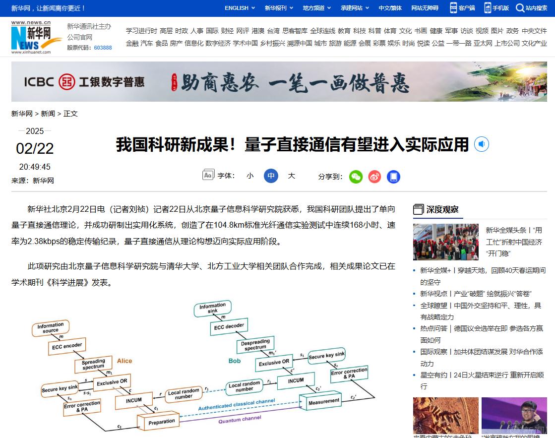 近日,伟德官网储能学院郑超教授领衔的储能量子直接通信与计算团队作为参研单位,与北京量子信息科学研究院和清华大学相关团队合作,提出单向量子直接通信理论,成功研制出实用化系统,创造了在104.8公里标准光纤通信实验测试中连续168小时、速率为2.38kbps的稳定传输世界纪录。相关成果于2025年2月21日在国际知名学术期刊《Science Advances》(《科学进展》)上发表,这标志着量子直接通信从理论构想成功迈向实际应用阶段。
