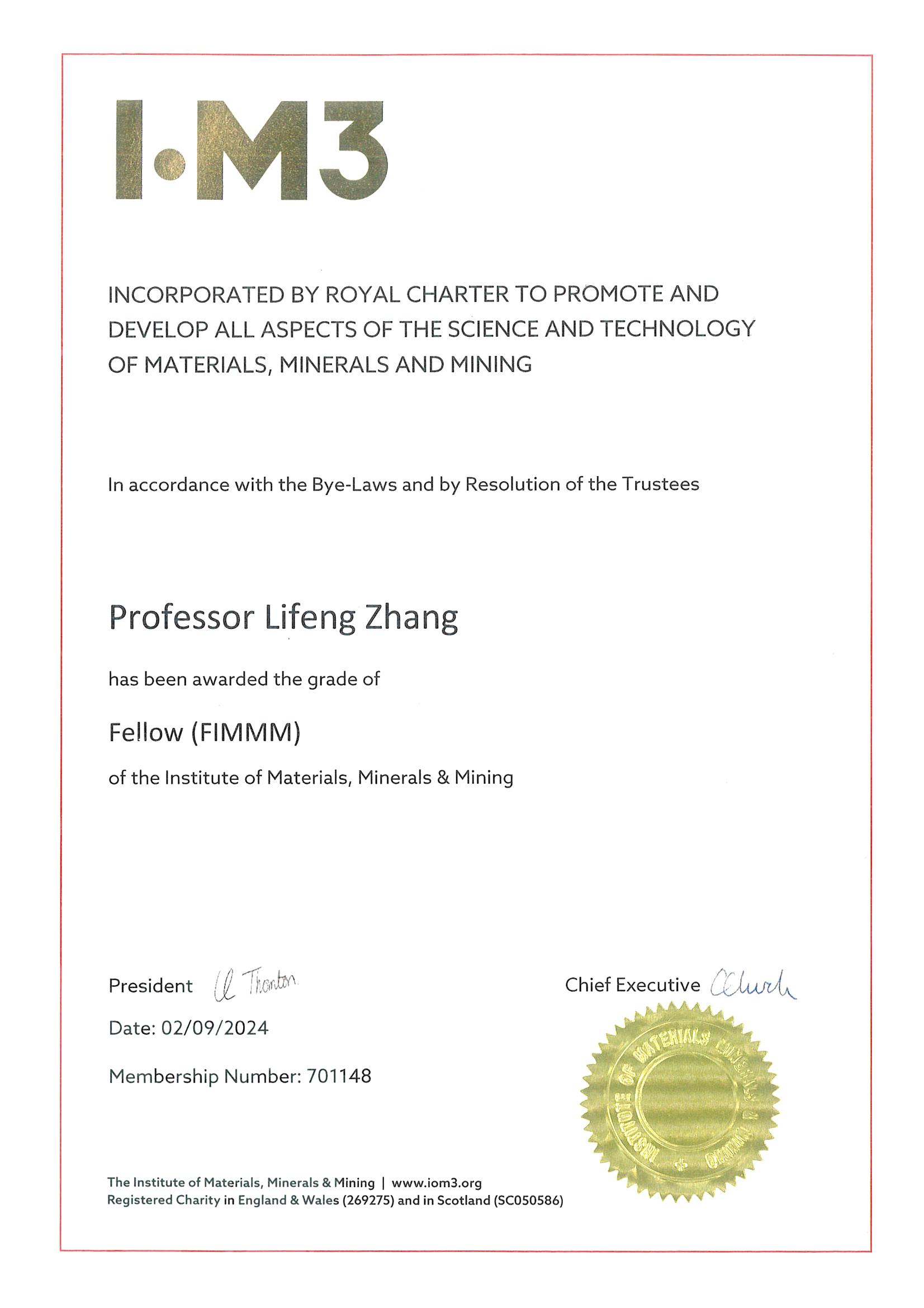 英国材料、矿物和矿业学会(The Institute of Materials,Minerals & Mining,简称IOM3)是具有世界性影响力的英国工程类学会,也是英国王室特许学会,其宗旨是促进材料科学与工程、地质学、采矿学以及相关技术的发展,是全球材料和矿业界的权威机构。根据专家提名推荐,学会遴选国际上在材料、矿物、采矿或其他IOM3所涵盖的技术学科中取得重要贡献和成就的人士为学会会士。