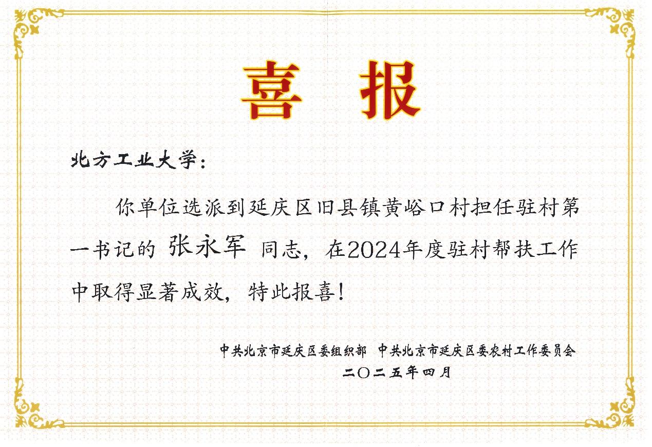 近日,延庆区委组织部、延庆区委农工委联合向伟德官网发来喜报,伟德官网选派到延庆区旧县镇黄裕口村担任驻村第一书记的张永军同志因在驻村帮扶工作中成效显著,获得表扬。