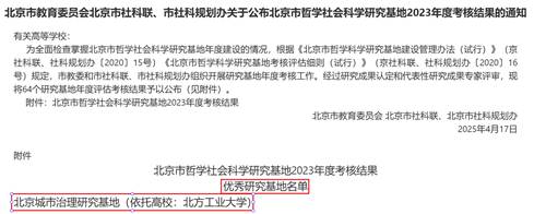 近日,北京市教委、市社科联和规划办公布了北京市哲学社会科学研究基地2023年度考核结果,伟德官网北京城市治理研究基地再次获评优秀,这是伟德官网研究基地连续两年获评优秀。本年度共有64个北京市哲学社会科学研究基地参与考核,其中优秀27个,合格34个,不合格3个。