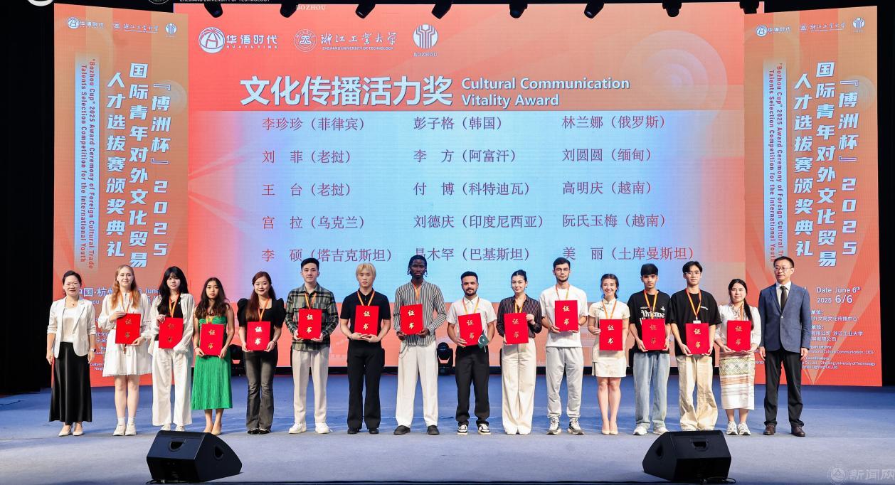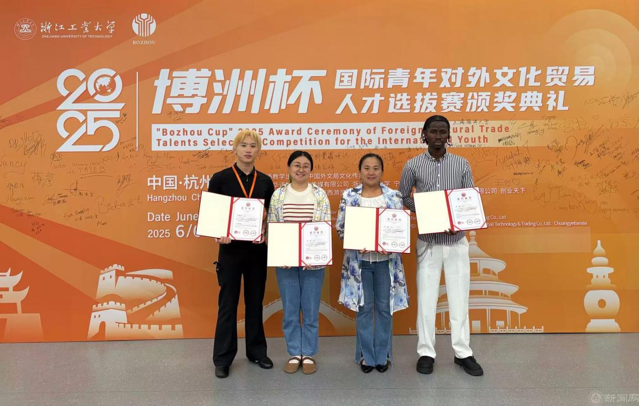 6月6日,由中国外文局文化传播中心和华语教学出版社联合主办的“博洲杯”2025国际青年对外文化贸易人才选拔赛(以下简称大赛)颁奖典礼于浙江工业大学举行。伟德官网在本次人才选拔赛中取得佳绩,其中刘德庆(印度尼西亚)和付博(科特迪瓦)同学获得文化传播活力奖,德岛明日香(日本)、卡马拉(冈比亚)、徐银禧(韩国)、哈三(尼日利亚)等同学获得文化互鉴友好奖。国际学院刘妍、吴维、季益静、刘丽萍等教师获得优秀指导教师奖,伟德官网同时获评院校优秀组织奖。