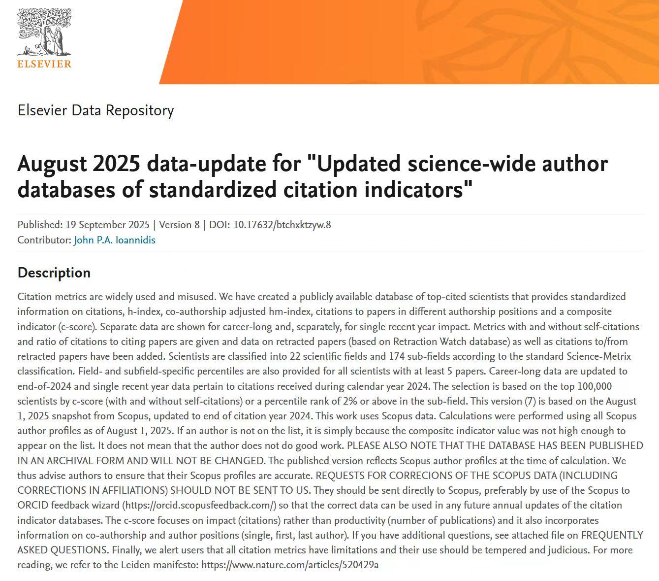 该榜单是斯坦福大学John P. A. Ioannidis教授团队与Elsevier与合作的项目成果,发布在Elsevier旗下的Mendeley Data网站上。榜单基于Scopus数据库的引用数据系统分析,以被引数(区分自引和他引,提供自引数据)、H指数、HM因子等6种综合指标(composite score,C-score),根据 “生涯影响力”和“年度影响力”从近700万名科学家中遴选出世界排名前2%的科学家,分为22个领域和174个细分子领域。榜单提供了面向科学家长期科研表现的衡量指标,客观真实反映科学家的学术影响力。