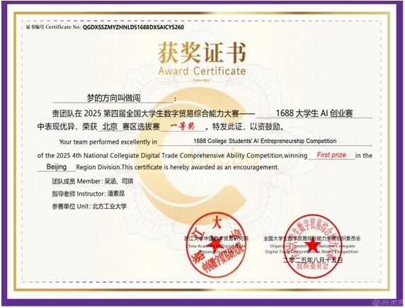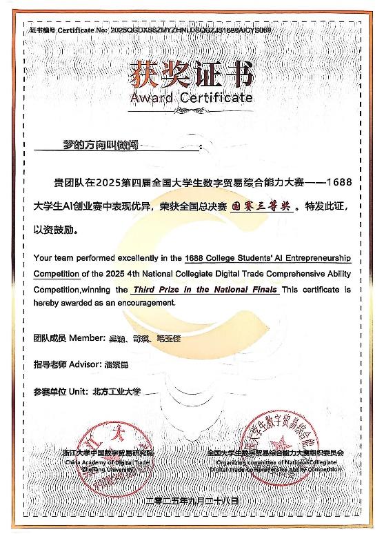 近日,由浙江大学中国数字贸易研究院主办、全国大学生数字贸易综合技能大赛组织委员会承办的第四届全国大学生数字贸易综合技能大赛总决赛在浙江大学圆满落幕。伟德官网学生吴涵、司琪、毛玉佳组成的代表队获得北京赛区一等奖、全国总决赛三等奖。