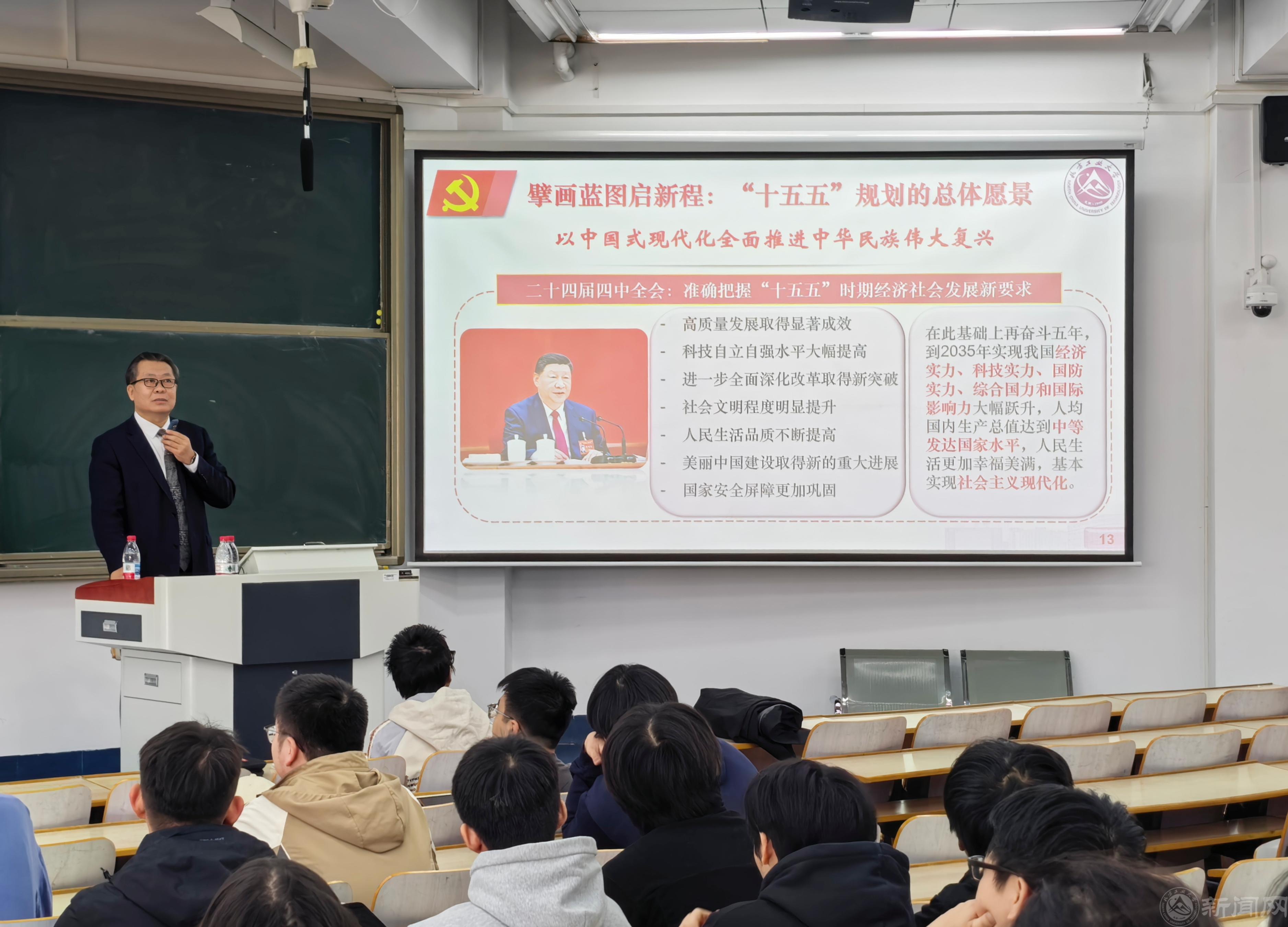 张立峰首先介绍了党的二十届四中全会召开情况,解读了“十四五”时期我国发展取得的重大成就及《中共中央关于制定国民经济和社会发展第十五个五年规划的建议》所作出的战略谋划和顶层设计。他结合个人成长经历和工作实践,以“教育投入—科研产出—人才质量”为主线,通过多组国际国内数据对比,从科教兴国的重大意义,教育强国、科技强国战略中人才的重要支撑作用等方面,为同学们深入解读了中国社会主义现代化教育科技人才创新体系跨越式发展的坚实步伐。张立峰希望同学们紧密结合《习近平新时代中国特色社会主义思想概论》课程的相关专题,重点学习全会就“一体推进教育科技人才发展”作出的重要部署,系统了解三者协同发展的战略意义与实践路径。张立峰强调,学习好贯彻好全会精神是当前和今后一个时期学校的一项重大政治任务。学校将深入学习贯彻党的二十届四中全会精神,科学谋划学校“十五五”发展,把全会要求转化为推动学校高质量发展的具体行动。