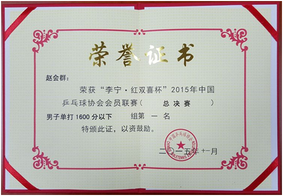 日前,2015年“李宁.红双喜杯”中国乒乓球协会会员联赛总决赛在浙江舟山体育馆落下帷幕,伟德官网计算机学院赵会群教授表现卓越,摘得男子单打1600分组的桂冠。