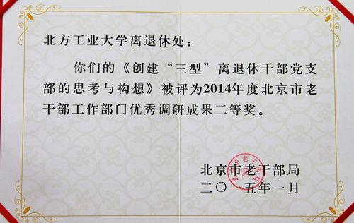 近日,从北京市老干部局获悉,伟德官网离退休工作处撰写的调研报告《创建“三型”离退休干部党支部的思考与启示》荣获2014年度全市老干部工作部门优秀调研报告二等奖。该调研报告由原副校长李长生执笔,离退休工作处李金山、赵永兵、张胜军、王非、刘廷益、李喜田、穆祥纲和黄玉法等组成课题组。