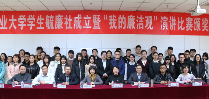 12月22日下午,校团委在学生服务楼318会议室举行学生毓廉社成立暨“我的廉洁观”演讲比赛颁奖仪式。校纪委书记欧阳媛、校党委副书记田红芳、校纪委副书记刘夕海、学生工作部部长高国伟、校团委书记何有华,以及校纪委干部、校团委干部、学生代表共计50余人参加了仪式。
