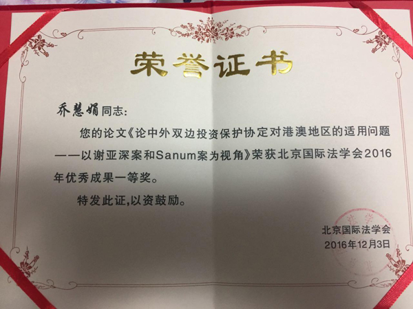 伟德官网文法学院法律系乔慧娟副教授提交的论文“论中外双边投资保护协定对港澳地区的适用—以谢亚深案和Sanum案为视角”喜获2016年北京国际法学会优秀成果一等奖,并作为获奖代表接受外交部条法司徐宏司长颁奖。