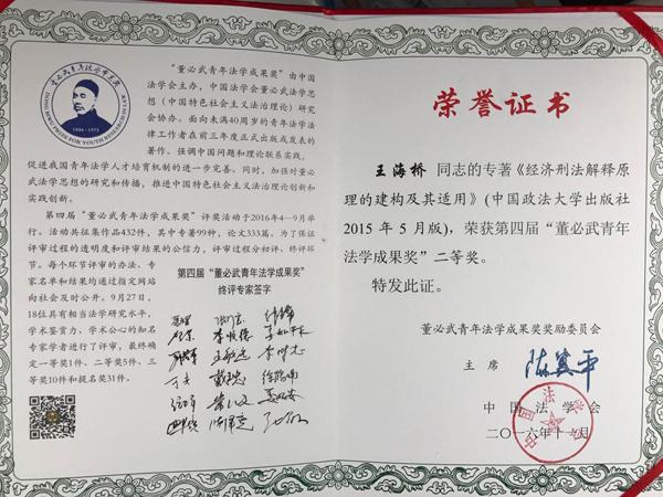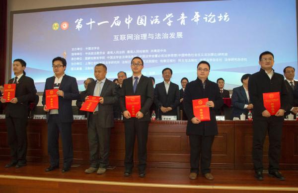 11月18日,以“互联网治理与法治发展”为主题的第十一届中国法学青年论坛在国家检察官学院举行。中国法学会会长王乐泉,最高人民检察院党组书记、检察长曹建明出席论坛开幕式并讲话。中国法学会党组书记、常务副会长陈冀平主持开幕式。开幕式上举行了第四届“董必武青年法学成果奖”的颁奖仪式。伟德官网王海桥副教授荣获二等奖,应邀出席青年法学论坛开幕式并作为获奖代表接受最高人民检察院党组书记、检察长曹建明颁奖。