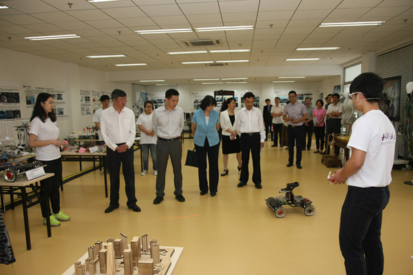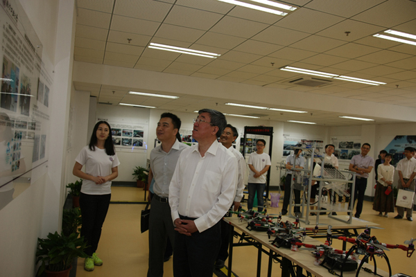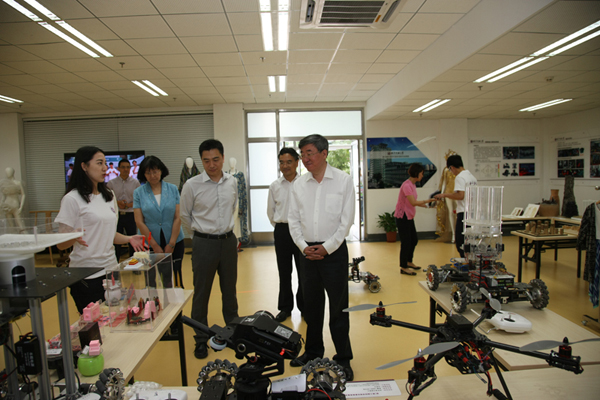 隋振江副市长又来到了学校“科学研究与大学生创新创业成果展”现场。他听取了学校主要科研优势项目的介绍,着重观看了学生科技成果演示。隋振江副市长对学生自主研发、制作的3D打印机、钱币自动分拣机、空中飞行器、虚拟现实消防模拟系统、组队战斗机器人以及学生创新创业项目都饶有兴趣,并与现场的同学们进行了深入交流。
