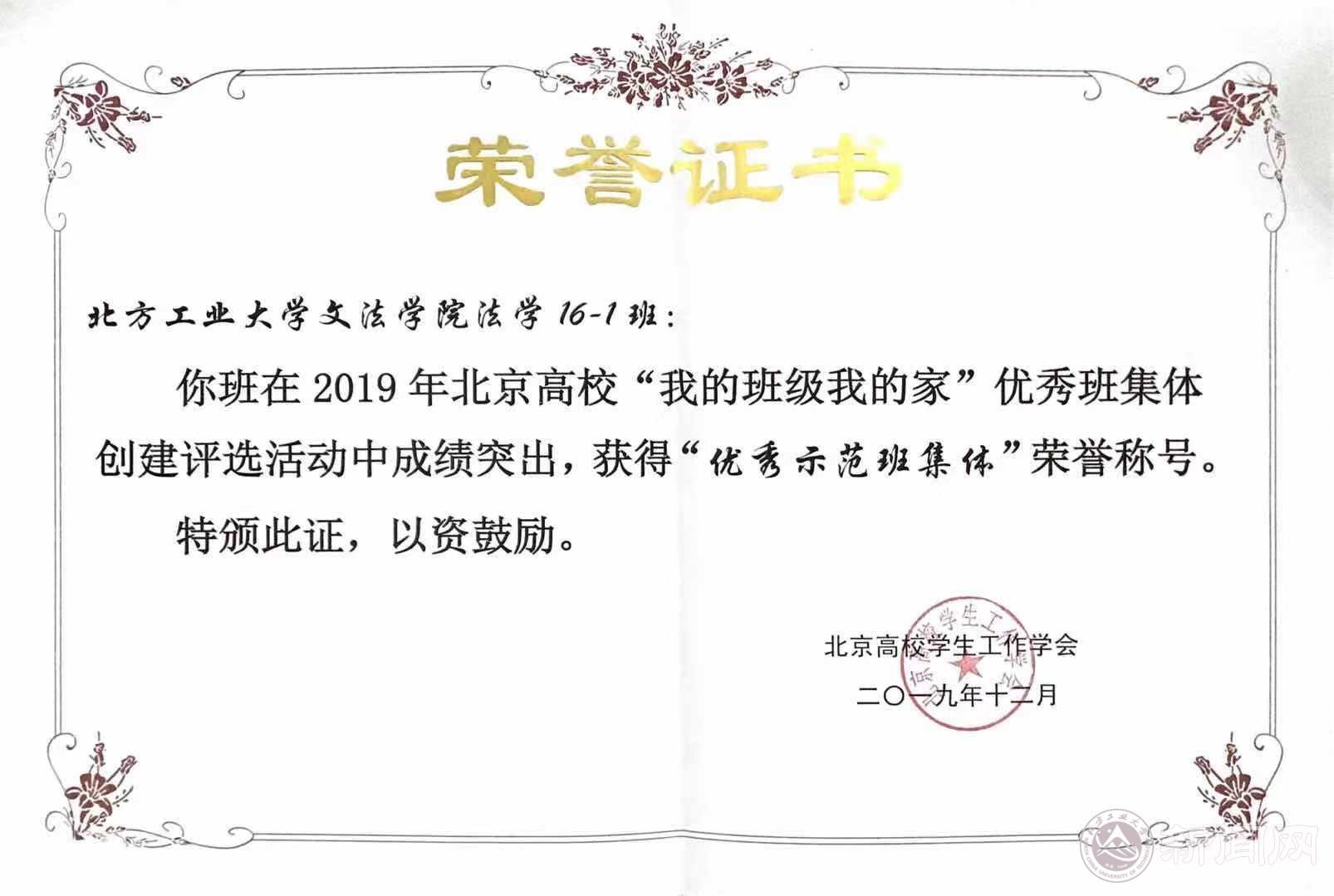 12月20日,2019年北京高校“我的班级我的家”优秀班集体创建答辩评选会在北京工业大学举行。伟德官网文法学院法学16-1班获得北京高校“优秀示范班集体”称号。