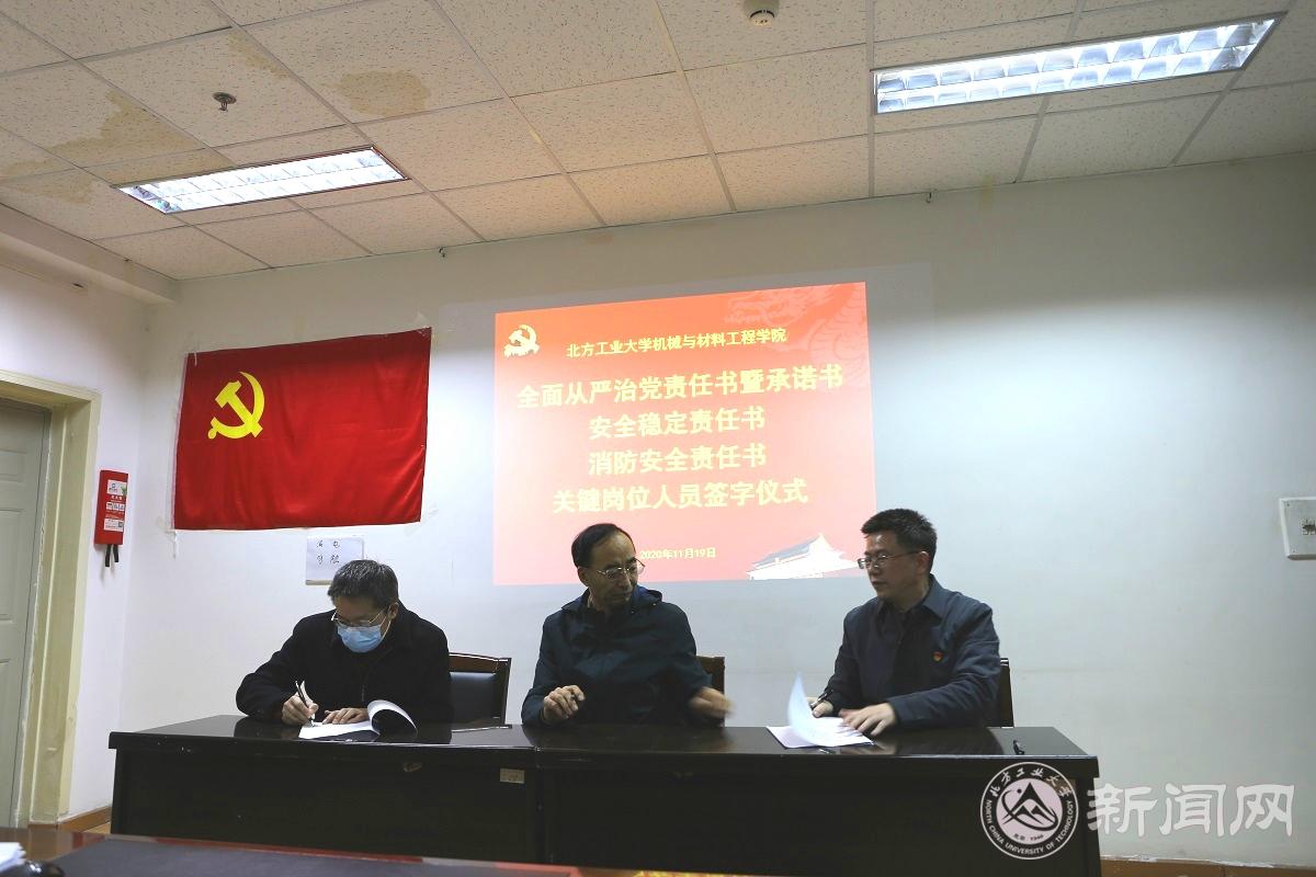 为进一步落实全面从严治党、安全稳定、消防安全等责任,11月19日,机械与材料工程学院举行从严治党等责任书签字仪式。在签字仪式上,院党委书记王文革、院长李强代表学院分别与学院各系/中心主任、责任教授、工程中心主任等岗位人员签订《全面从严治党主体责任书暨承诺书》、《安全稳定责任书》、《消防安全责任书》。院班子成员参加了签字仪式。