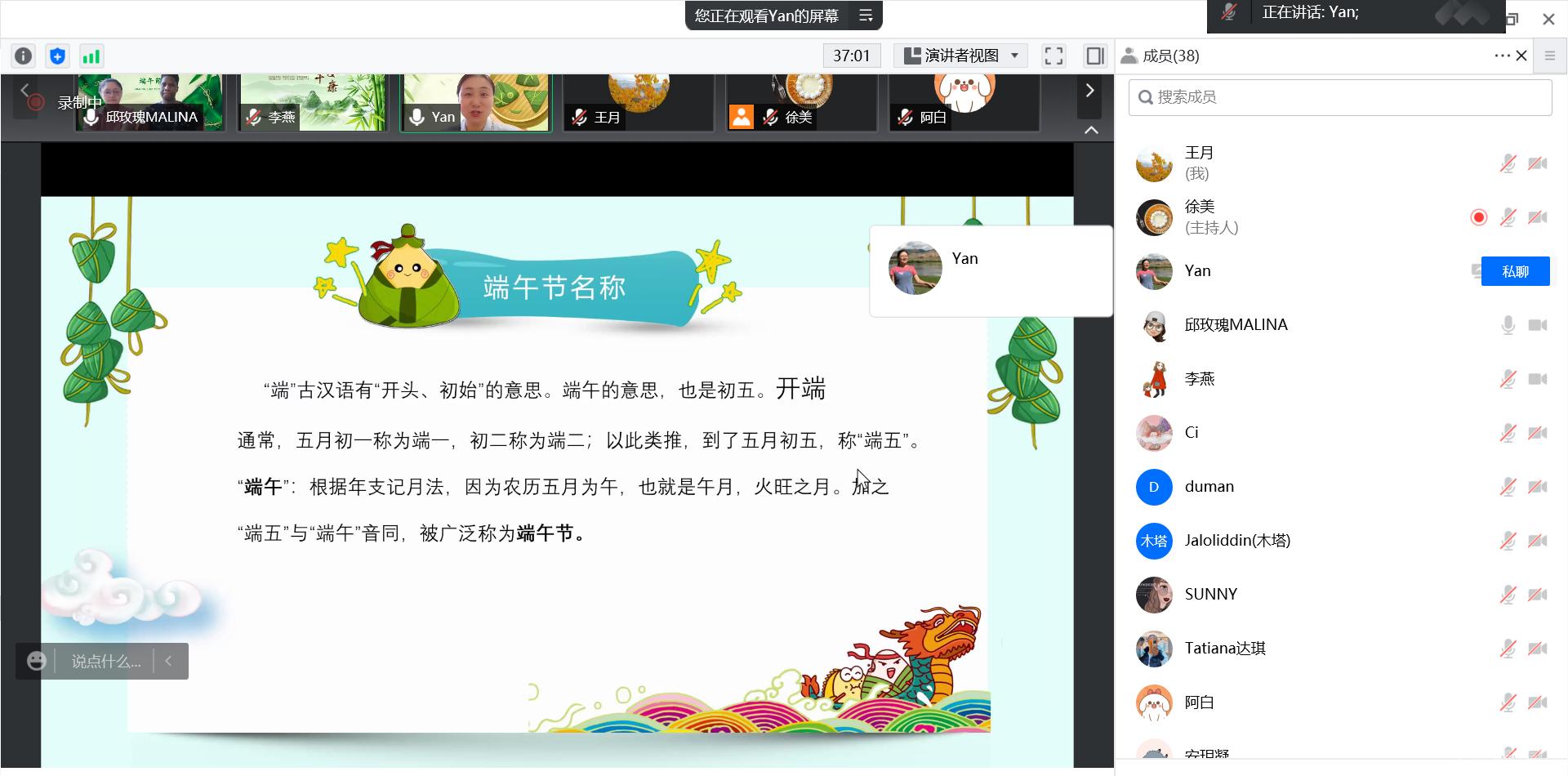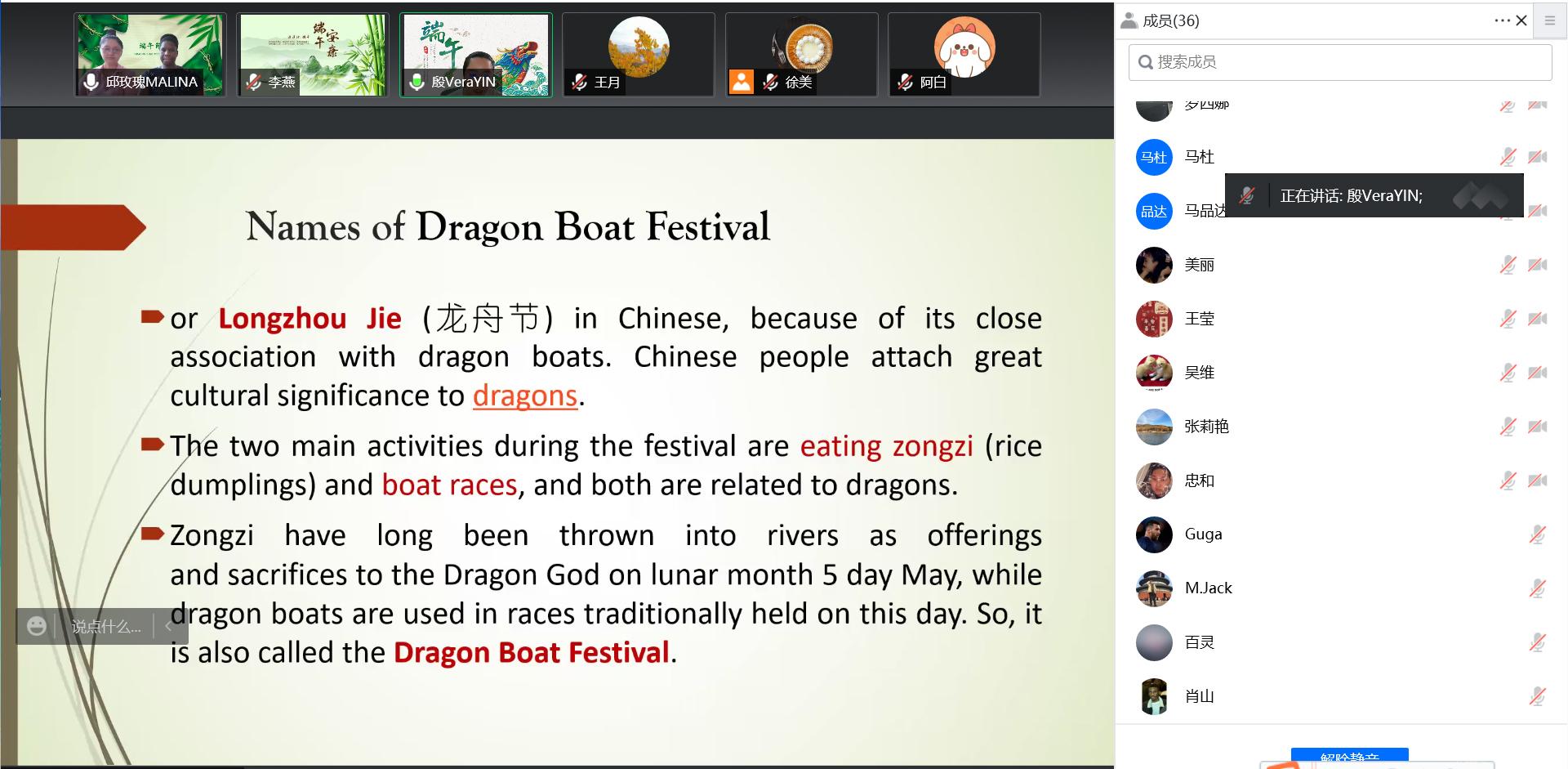 6月3日下午,端午节来临之际,国际处国际学院举办了主题为“中外话端午,暖暖粽意情”的端午节线上文化活动,中外师生欢聚云端,共同度过了一个愉快的传统佳节。
