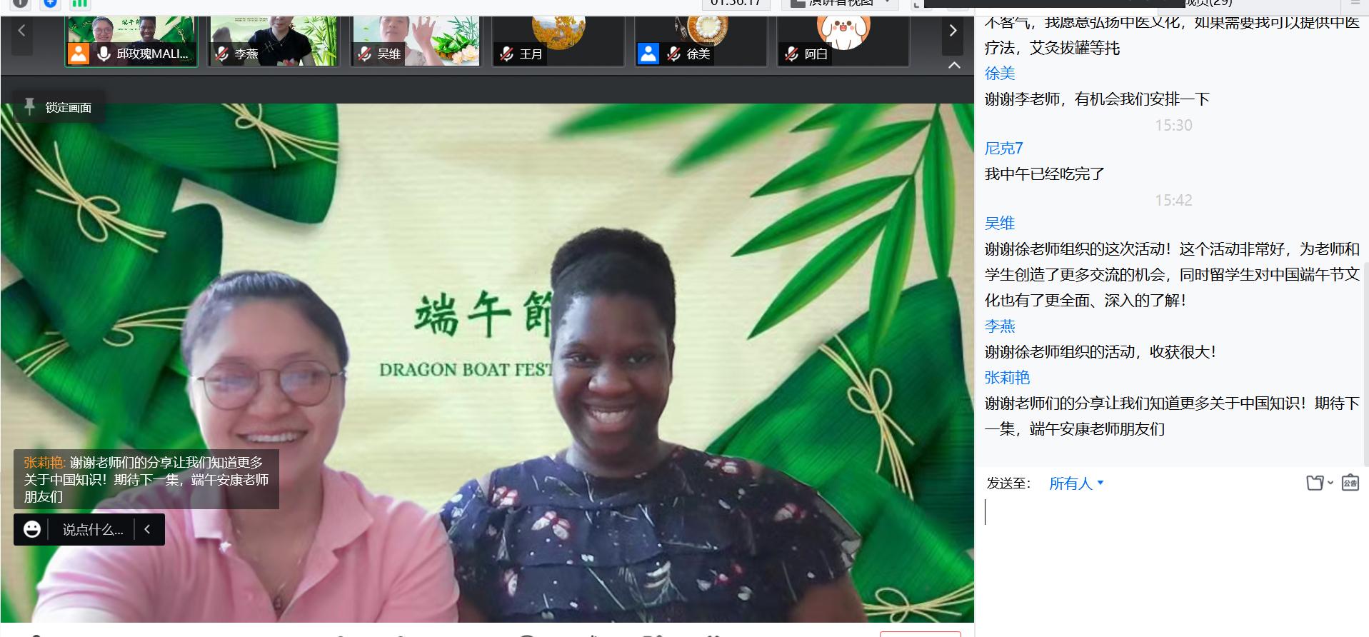 津巴布韦籍留学生歌真表示这次线上过端午节非常“独一无二”,在学习各种知识的同时还交到了新的朋友,她感谢老师们精彩的演讲和充满热情的展示,表示非常期待下一次活动。