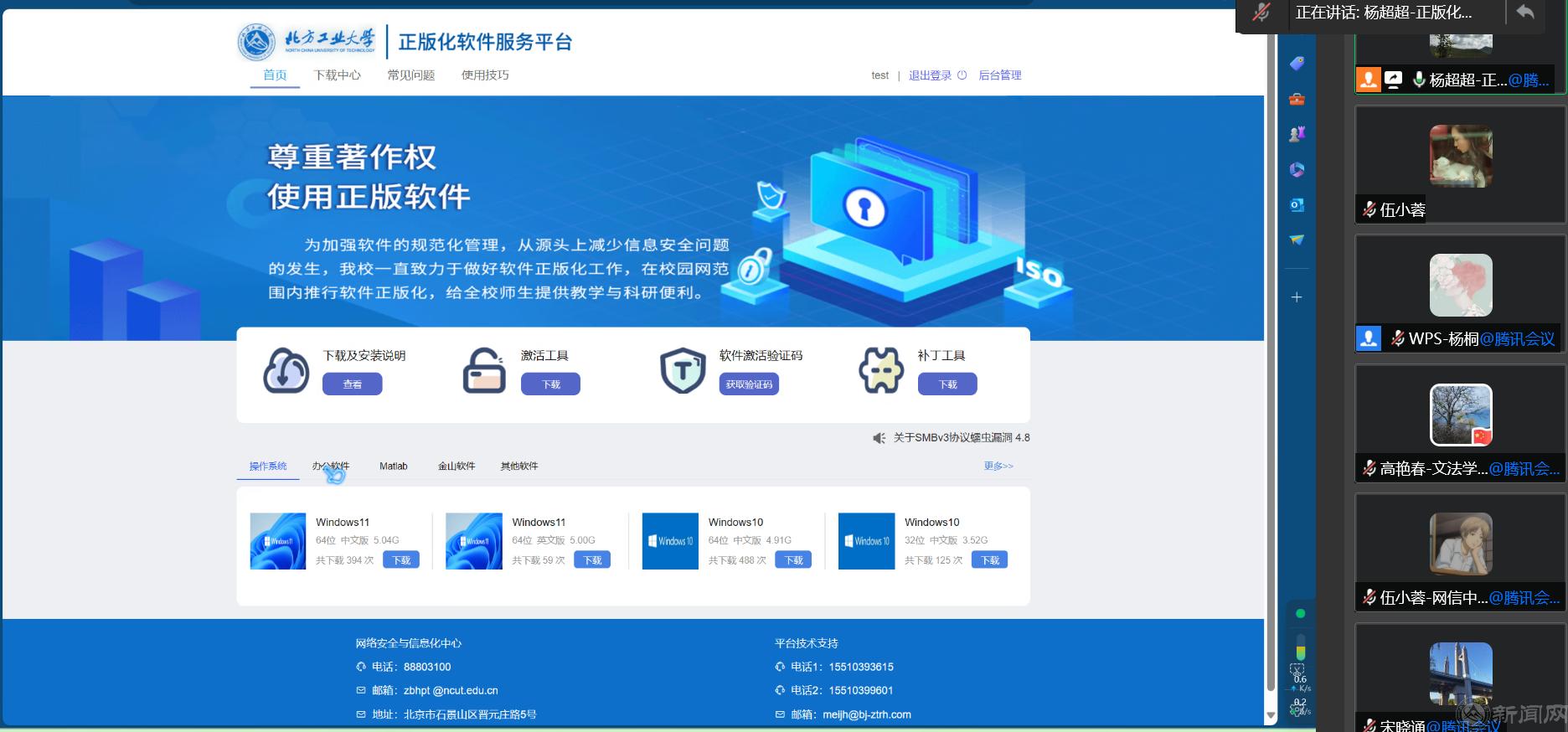 会议主要介绍了国家及北京市实施软件正版化的相关政策要求、学校“正版化软件服务平台(http://software.ncut.edu.cn/)”的操作使用方法及WPS 365教育版的安装、激活、使用方法。
