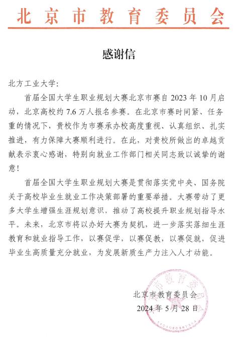近日,北京市教育委员会向伟德官网发来感谢信,感谢学校对首届全国大学生职业规划大赛北京市赛工作的支持。