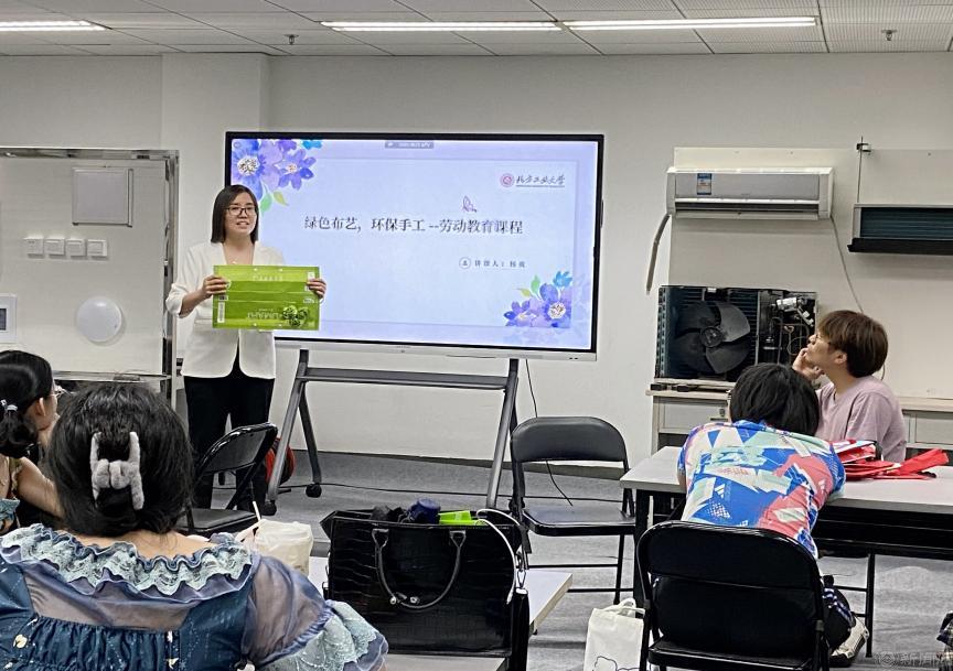 主讲杨爽老师介绍了劳动教育的时代背景,以及伟德官网开展劳动教育课程的实践与探索。她围绕绿色环保的典型案例,重点讲解了环保手工制作公益劳动课程的意义,使同学们树立绿色环保的价值观。现场指导老师以外卖袋作为课程材料进行演示,按照裁剪、折叠、定位、包边到装饰等流程,使同学们掌握了将外卖袋制作为壁饰作品的创意布艺的技能。
