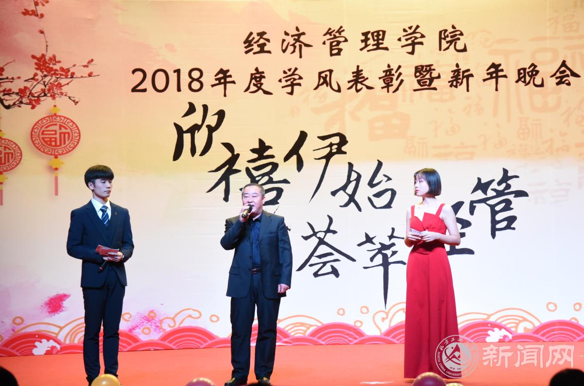 12月18日晚,经济管理学院在图书馆报告厅举办“欣禧伊始 荟萃经管”2018年度学风表彰暨新年晚会。学生工作部部长高国伟、校团委书记何有华、学生工作部副部长赵帅、经济管理学院全体领导班子成员、各系主任、班导师、辅导员及600余名同学共同参加了本次晚会。