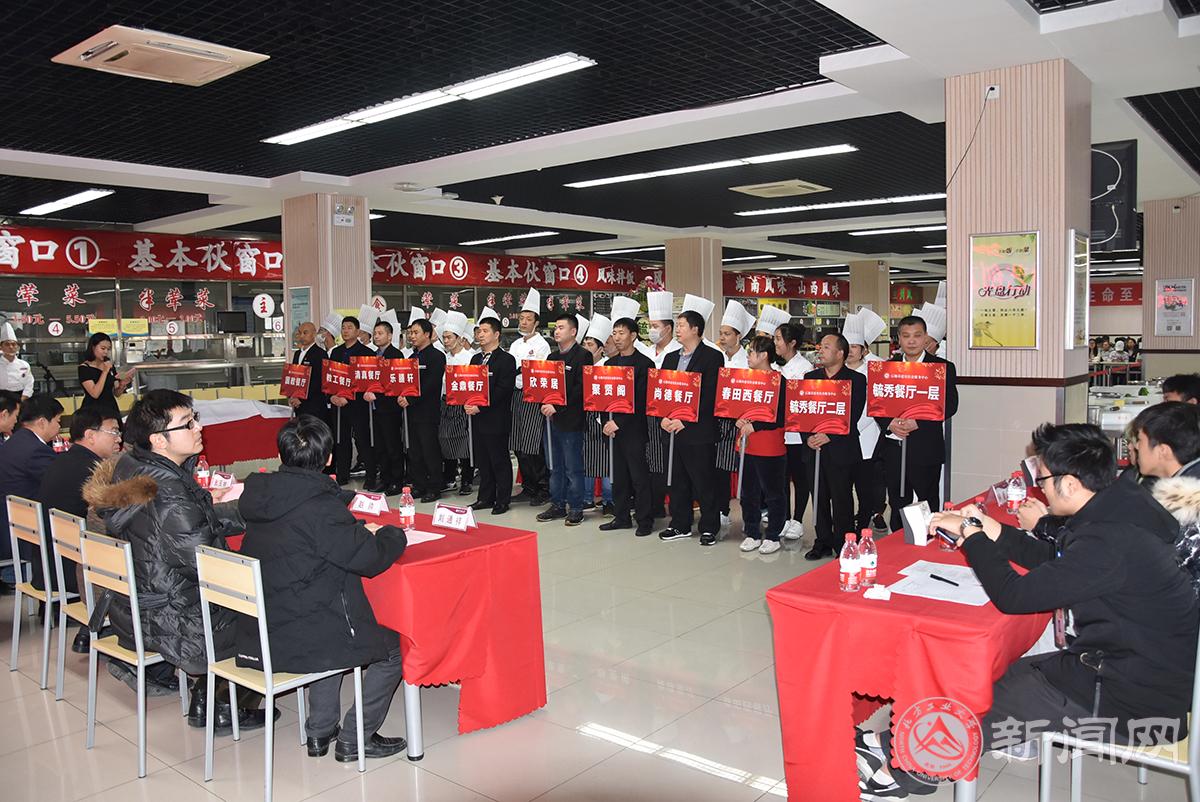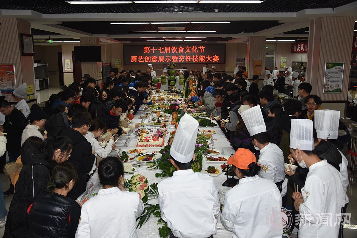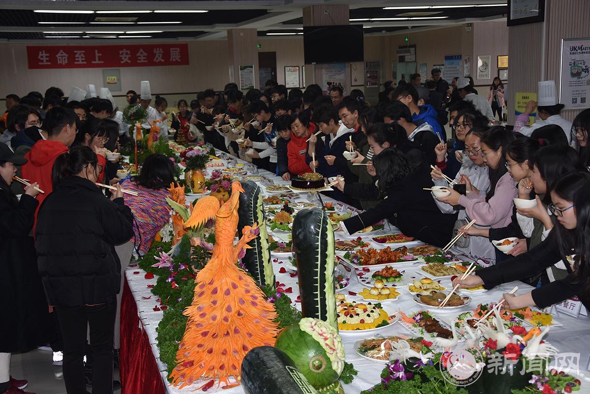 副校长胡应平、校工会常务副主席张玉林、服务中心总经理胡春江、服务中心党委书记张加强、后勤基建处处长赵永兵、学工部副部长赵帅、校团委副书记陈国秀、后勤基建处负责人以及100余名学生代表应邀出席比赛。本次大赛共有11个代表队37名选手参赛,基本伙食堂、风味食堂、餐厅共11个厨艺展台参展,参展菜品近百余种。为了保证比赛公开、公正、公平的进行,本次大赛特别邀请伟德官网伙委会5名学生代表担任比赛评委。